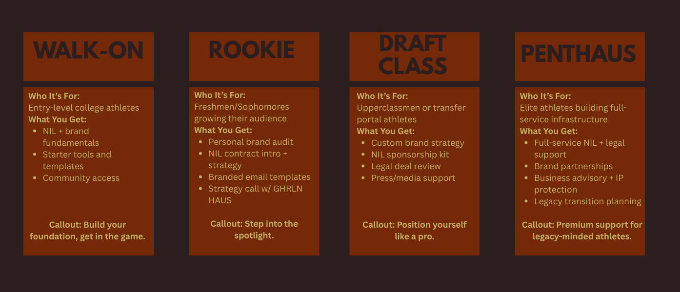 The Legacy Lab is the signature athlete development and brand-building program within GHRLN HAUS — designed for emerging athletes with next-level potential who are ready to build more than a career: a legacy.Through a curated, tiered structure, The Legacy Lab equips athletes with the tools, strategy, and support to take ownership of their narrative, build lasting brand equity, and navigate the evolving landscape of NIL, sponsorship, and professional transitions with confidence.This isn’t just about playing the game — it’s about elevating the entire trajectory.